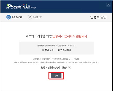 기타 메인으로 이동 기타 학교소개 입학안내 대학 대학원 학사안내 대학생활 동아광장 1차-개교80주년- 닫기 기타 기타 Agent 설치 단말 SNS 목록열기 FACEBOOK 공유하기 TWITTER 공유하기 BLOG 공유하기 KAKAO STORY 공유하기 SNS 목록닫기 인쇄 url 복사 NAC 에이전트 설치 단말1 작업표시줄 우측의 숨겨진 아이콘 표시 클릭 후 ‘N’모양의 아이콘 더블클릭2- ID: 개인의 학번/사번 입력- PW: 학생정보/그룹웨어 로그인 PW 입력※ 재직, 재학, 휴학생만 로그인 가능3 아래와 같은 메시지는 ‘신청’ 선택4 작업 완료 메시지 확인 후 재로그인